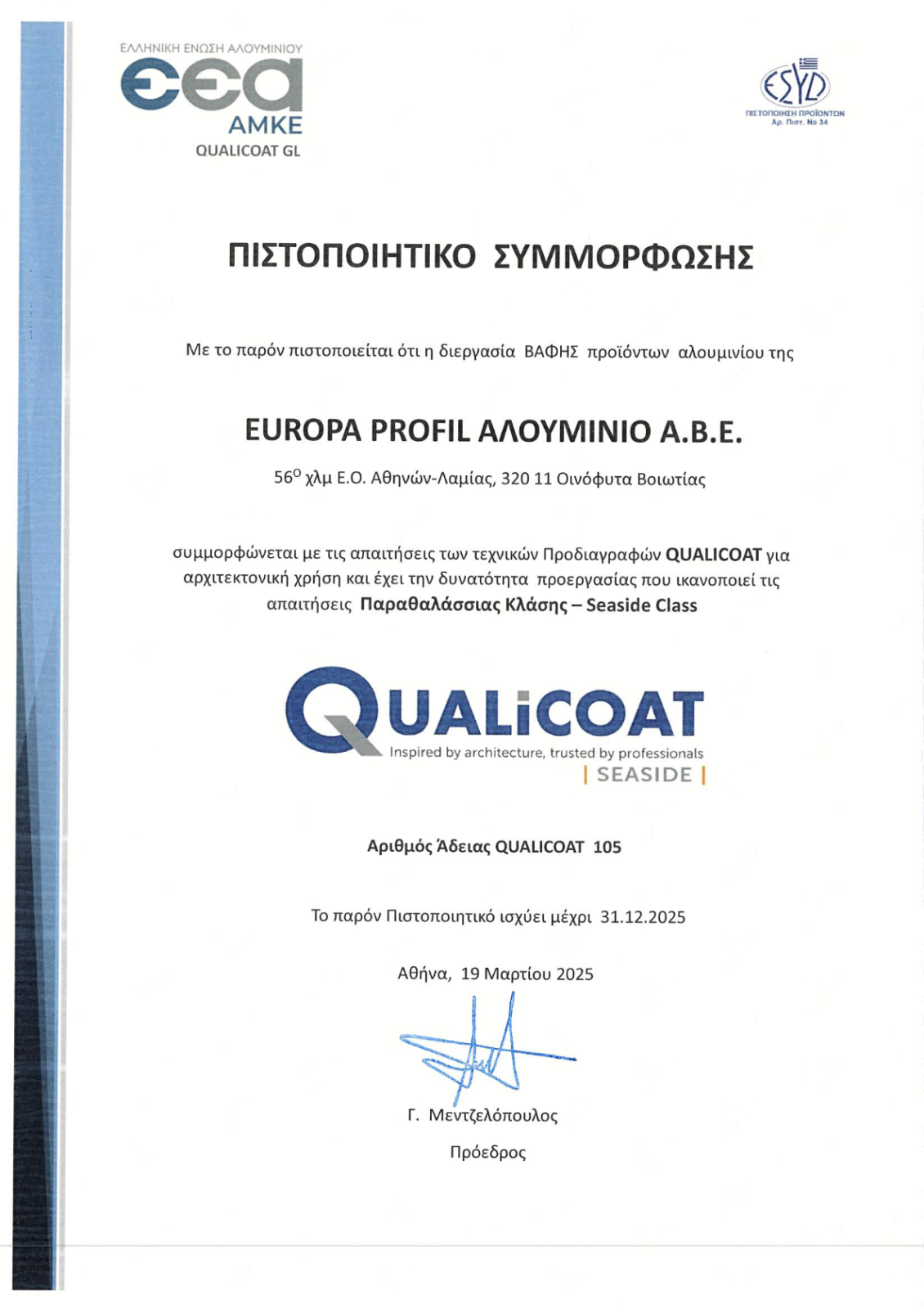 Η μονάδα ηλεκτροστατικής βαφής είναι πιστοποιημένη με τα διεθνή πιστοποιητικά QUALICOAT, QUALIDECO και Seaside Class, που εγγυώνται ότι τα τελικά προϊόντα δε φέρουν οποιοδήποτε ελάττωμα στη βαφή.